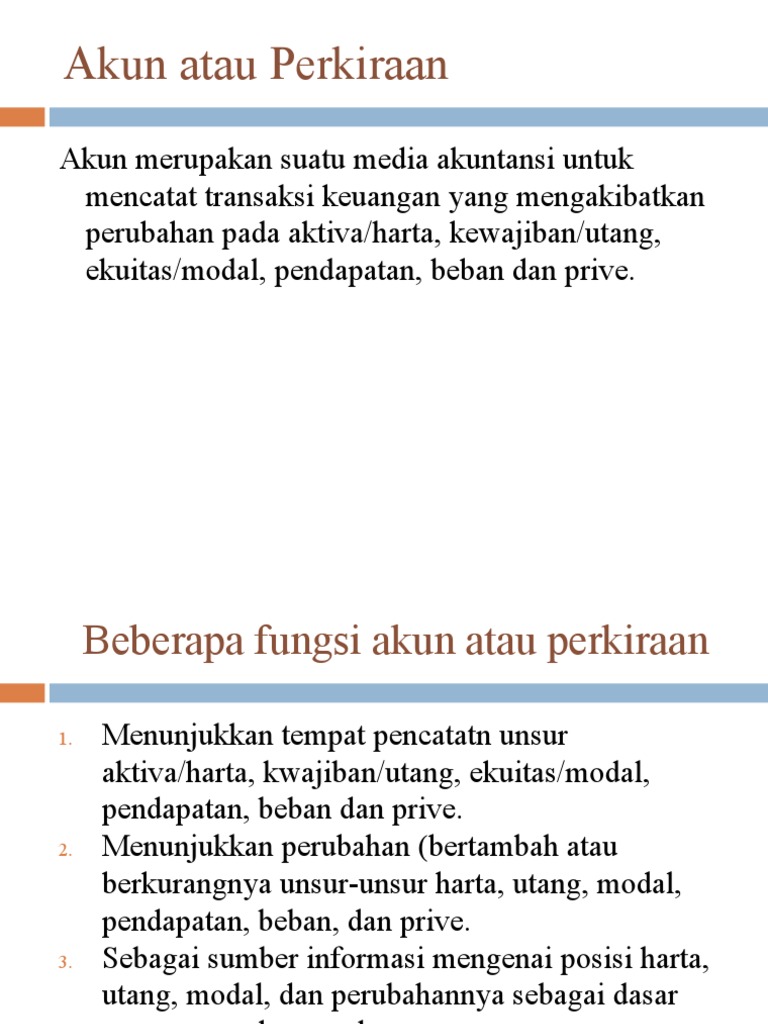 Kita akan mencoba untuk memulai definisi satu satu dari ketiga hal tersebut. Akun adalah media akuntansi yang merupakan tempat untuk mencatat transaksi keuangan yang mengakibatkan perubahan pada hartaaktiva kewajibanutang modalekuitas pendapatan dan biayabeban. Yaitu Aset harta Kewajiban utang EkuitasModal capital Pendapatan dan BiayaBeban.